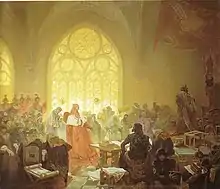 Pintura de Alfons Maria Mucha, mostrando o Cardeal Fantin explicando a posição da Igreja sobre a eleição de Jorge