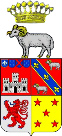 ![]() Escudo de armas esquartelado. No primeiro quartel, em campo de goles, um castelo com sua muralha e torre; e firmados em chefe, quatro escudetes: ao primeiro em campo azul, uma flor de liz de prata e bordadura de ouro; ao segundo e quarto de azul, cinco besantes de prata postos em santor; e ao terceiro em campo de azul, uma aspa de goles. No segundo quartel, as armas dos Carneiros: em campo vermelho, uma banda de azul coticada de ouro e carregada de três flores de liz do mesmo metal entre dois carneiros de prata passantes armados de ouro. No terceiro quartel as armas dos Silvas: em campo de prata, um leão de goles, rompente, armado de azul. No último quartel, as armas dos Coutinho: em campo de ouro, cinco estrelas de vermelho com cinco raios postas em aspa. Coroa: a de conde. Timbre: um dos carneiros das armas.[1] | |