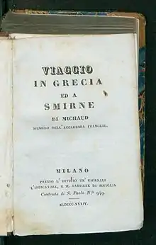 Seus serviços políticos foram agora recompensados com a cruz de um oficial da Legião de Honra e o modesto cargo de leitor do rei, dos quais ele foi privado em 1827 por ter se oposto ao "Loi d'Amour" de Peyronnet contra a liberdade de imprensa. Pressione. Em 1830-1831, viajou pela Síria e Egito com o objetivo de coletar materiais adicionais para o Histoire des Croisades; sua correspondência com um colega explorador, Jean Joseph François Poujoulat, consistindo praticamente em discussões e elucidações de vários pontos desse trabalho, foi posteriormente publicada ( Correspondance d'Orient, 7 vols., 1833-1835). Como o Histoire, é mais interessante do que exato. A Bibliothèque des croisades, em mais quatro volumes, continha as "justificativas de Pièces" do Histoire. Michaud morreu em Passy, onde sua casa estava desde 1832.