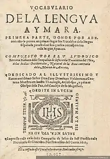 - "Arte y gramática muy copiosa de la Lengua Aymara. Con muchos, y varios modos de hablar para su mayor declaración, con la tabla de los capítulos, y cosas que en ella se contienen. &c."; e