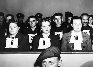 - Josef Kramer, Fritz Klein, Franz Hössler, Juana Bormann, Irma Grese, Elisabeth Volkenrath, Franz Stofel, Peter Weingartner, Karl Francioh, Anchor Pichen e Wilhelm Dorr foram condenados à morte por enforcamento.[6]
