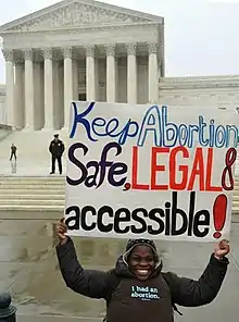Grupos minoritários experimentam pobreza e altas taxas de gravidez devido à falta de educação sexual e contracepção disponíveis. Além disso, as mulheres de famílias de baixa renda são mais propensas a recorrer a provedores de aborto inseguro e, como resultado, são mais propensas a serem hospitalizadas por complicações relacionadas ao procedimento do que as mulheres de alta renda.[15][73][69][70] Embora os abortos tenham sido legalizados no Roe vs. Wade Suprema Corte de 1973, muitos obstáculos ao acesso das mulheres permanecem. Mulheres jovens, de baixa renda, LGBTQ, rurais e não brancas enfrentam os maiores obstáculos em seus esforços para obter um aborto em muitas partes dos EUA,[74] Os obstáculos para obter um aborto nos EUA incluem a falta de cobertura do Medicaid para abortos (exceto no caso de certas circunstâncias, como risco de vida), leis estaduais restritivas (como as que exigem o consentimento dos pais para um menor que procura um aborto) e cláusulas de consciência que permitem que os profissionais médicos se recusem a fornecer abortos às mulheres, informações relacionadas, ou referências adequadas.[74] Outros obstáculos ao acesso incluem a falta de segurança para provedores e pacientes em instalações de aborto, os legisladores políticos conservadores e antiaborto e os cidadãos que os apoiam, e a falta de provedores de aborto qualificados, especialmente em estados rurais.[66]