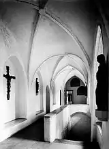 O aparecimento da casa conventual e do danzker (espécie de sanitários dos castelos) não pode ser datado com precisão. A casa conventual deve ter sido construída antes da enfermaria dos homens, uma vez que o convento é considerado no esboço e no desenho desta última. As bases da ala oeste talvez tenham sido parcialmente reutilizadas no novo edifício. As fundações das restantes três alas, que se encontravam por baixo do pavimento do pátio, foram descobertas nas escavações realizadas entre 1926 e 1927. Partindo do pressuposto de que o velho chafariz do castelo, que foi conservado, se encontrava no meio do pátio da casa conventual, esta teria as seguintes dimensões: pátio - 22,85 por 29 metros; dimensões externas do edifício de quatro alas - 47,5 por 58 metros. As alas norte e sul iam ao encontro da muralha oriental, de modo que a ala leste se estendia entre elas. Todas as três alas escavadas tinham duas naves, sendo as alas norte e sul não estavam, originalmente, divididas por paredes transversais. Na ala sul, mais ampla, são reconhecíveis divisórias transversais nos andares superiores previamente existentes, uma vez que o seu apoio, ao invés dum pilar central, estava organizado com duas colunas. Nas últimas décadas do século XVI, quando a ala da igreja palatina foi construída por ordem do marquês Jorge Frederico, ainda como parte da casa conventual, as alas sul e oeste foram demolidas.
