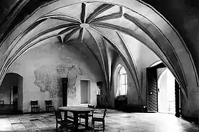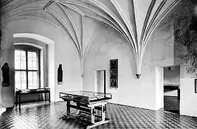 A partir do pátio podia subir-se ao andar superior através duma escadaria com dois alpendres. No alpendre superior, um portal com arco quebrado conduzia ao vestíbulo de entrada. A parede consistia, parcialmente, em tijolos de perfil invulgarmente altos, instalados de acordo com a alvenaria da parede da casa. Originalmente, o vestíbulo não tinha as dimensões que viria a adquirir. Na parte leste da parede encontravam-se dois arcos quebrados, com escudos, e também duas portas, uma sob cada um dos arcos. Mais tarde, quando, no século XVI foi construído um andar superior sobre o andar principal, a escadaria também foi substituída por uma maior. A abóbada tinha uma forma estranha. A abóbada, em pedra calcária, apoiava-se sobre consolas esculpidas no mesmo tipo de pedra: um homem acocorado, um cão com coleira ao pescoço, uma cabeça de carneiro, uma consola rendilhada. O seu significado permanece incerto, sendo possivelmente figuras alegóricas prussianas. A janela do lado ocidental, virada ao pátio, tinha um parapeito elevado. Neste, encontrava-se uma porta que dava passagem para um cave através duma escadaria em espiral instalada na espessura da parede. Foram preservados restos das pinturas murais do século XV: sobre a porta de entrada da sala de estar ficava o brasão de Frederico da Saxónia, o penúltimo grão-mestre. O quarto tinha, tal como a sala de estar, as consolas e os apoios das abóbadas em calcário esculpido.