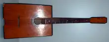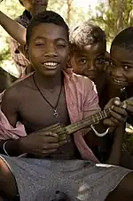 Um garoto tocando um bandolin ou kabosy com um longo traste.