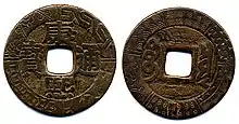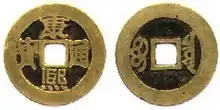 Under the Kangxi Emperor cash coins with the inscription Kangxi Tongbao were produced with both a Chinese character and a Manchu character on the reverse side of the coin at provincial mints,[4] while the Ministries of Revenue and Public Works in the city of Beijing, Zhili exclusively used Manchu characters.