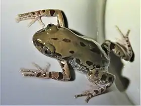 Os indivíduos são grandes, medindo 40 milímetros, e cinzas, possuindo manchas pretas arredondadas ou alongadas no lugar de listras no dorso, que apresenta coloração entre o creme e o marrom, porém existem registros de espécimes sem manchas. Seus discos adesivos são menores do os da Kassina maculifer, além de apresentar um padrão de manchas dorsais diferente.[2]