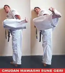 - Mawashi geri (chute circular) - Principal chute e o mais poderoso, aplicado com a tíbia/canela nas versões:(chute baixo (gedan), chute médio (chudan) ou chute alto (jodan)).