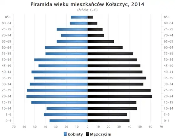 - «Kołaczyce (Subcarpácia) mapas, imobiliário, GUS, acomodações, escolas, região, atrações, códigos postais, desemprego, salário, ganhos, educação, tabelas, demografia, jardins de infância». Polska w liczbach (em polonês). Consultado em 29 de fevereiro de 2020