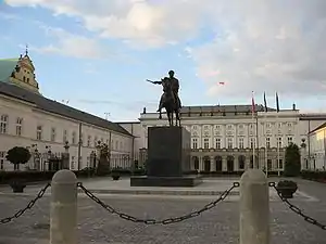 Estátua eqüestre de Bertel Thorvaldsen do Príncipe Józef Poniatowski diante do Palácio Presidencial.