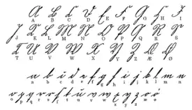 Escrita kurrent dinamarquesa (»gotisk skrift«), ca. 1800, com Æ e Ø no fim do alfabeto