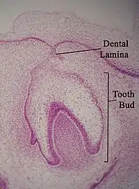 A lâmina dentária é uma banda de tecido epitelial visto em secções histológicas no desenvolvimento de um dente. A lâmina dental é primeira evidência de dente e começa a se desenvolver na sexta semana no útero ou três semanas após a ruptura da membrana bucofaringeal. É formado nas células do ectoderma oral e se proliferam mais rapidamente do que células de outras áreas. Eventualmente, a lâmina dentária desintegra-se em pequenos aglomerados de epitélio e é reabsorvido. Nas situações em que os não são reabsorvidos, cistos são formadas ao longo do desenvolvimento dente e retardam a sua erupção na cavidade bucal.