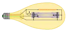A luz da produzida é uma mistura das radiações azuladas provindas do arco elétrico, de radiações amareladas do filamento incandescente e de radiações vermelhas de um eventual revestimento fluorescente na parte interna do bulbo exterior.[1][2]