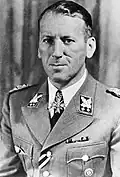 1943–1945 | Foi um SS-Obergruppenführer. Ele foi nomeado por Himmler como chefe do SD (Sicherheitsdienst) em janeiro de 1943, o SiPo, (Sicherheitspolizei) composto pelas forças combinadas da Gestapo e do Kripo (Kriminalpolizei) e do RSHA (Reichssicherheitshauptamt); após o assassinato de Reinhard Heydrich. Além disso, Kaltenbrunner comandava os esquadrões da morte Einsatzgruppen. Ele foi o líder SS de mais alto escalão a ser julgado em Nuremberg e executado.[26] | |