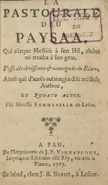 - "Mais l'association de la musique et du genre pastioral donnait en Béarn, au XVIIIe siècle une floraison d'un autre type : la chanson. Ce fut l'oeuvre de Cyprien Despourrins (1698-1759). [...] La trentaine de chansons qu'il laissa (réunies et publiées en 1820 par Vignancour) constitue un modèle souvent imité [...] [English: But the combination of music and the pastoral genre in Béarn during the eighteenth century brought about the flourishing of another kind of art: song. It was the work of Cyprien Despourrins (1698-1759). [...] The thirty songs he left behind (collected and published in 1820 by Vignancour) are a model often imitated... ]". Robert Lafont, op. cit (448)