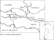 ![]() Mapa da terra indígena Hupdá, onde a língua é mais falada.[2] | ||
