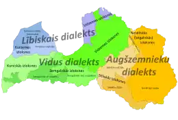 O agrupamento de dialetos e variações no letão é um tópico ainda em debate,[25] mas uma das correntes mais aceitas pelos linguistas é a que afirma a existência de três dialetos principais no letão, distinguidos pelas diferenças prosódicas, fonéticas e morfológicas: dialeto central (vidus dialekts), dialeto livoniano (lībiskais dialekts) e alto letão (augšzemnieku dialekts). Cada dialeto possui suas próprias variações que não devem ser confundidas com as línguas livoniano, curônio, semigálico e selônio.[26]