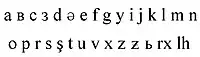 - Latino (193s): A/a, B/в, C/c, Ç/ç, D/d, Ə/ә, E/e, F/f, G/g, Y/y, I/i, J/j, K/k, L/l, M/m, N/n, O/o, P/p, R/r, S/s, Ş/ş, T/t, U/u, V/v, X/x, Z/z, ƶ, ь, rx, lh