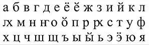 - Alfabeto Russo: А/а, Б/б, В/в, Г/г, Д/д, Е/е, Ё/ё, Ж/ж, З/з, И/и, Й/й, К/к, Л/л, М/м, Н/н, О/о, П/п, Р/р, С/с, Т/т, У/у, Ф/ф, Х/х, Ц/ц, Ч/ч, Ш/ш, Щ/щ, Ъ/ъ, Ы/ы, Ь/ь, Э/э, Ю/ю, Я/я