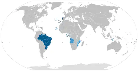 Durante a Era dos Descobrimentos, marinheiros portugueses levaram o seu idioma para lugares distantes. A exploração foi seguida por tentativas de colonizar novas terras para o Império Português e, como resultado, o português dispersou-se pelo mundo. Brasil e Portugal são os dois únicos países cuja língua primária é o português. É língua oficial em antigas colônias portuguesas, nomeadamente, Moçambique, Angola, Cabo Verde, Guiné Equatorial,[10][11][12] Guiné-Bissau e São Tomé e Príncipe, todas na África.[13] Além disso, por razões históricas, falantes do português, ou de crioulos portugueses, são encontrados também em Macau (China), Timor-Leste, em Damão e Diu e no estado de Goa (Índia), Malaca (na Malásia, que conta com utilizadores do crioulo kristáng, ou Língua cristã), em enclaves na ilha das Flores (Indonésia), Baticaloa no (Sri Lanka) e nas ilhas ABC no Caribe.[14][15]