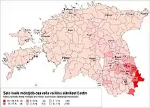 orcentagem de falantes de Seto nos municípios da Estônia de acordo com o censo da Estônia em 2011.