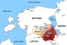 Sul da Estônia hoje. Seto é marcado com cor vermelha clara.