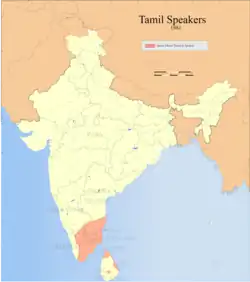 ![]() Distribuição de falantes de tâmil no sul da Índia e no Sri Lanka (1961) | ||