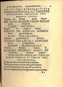 O Utópiano tem o seu próprio alfabeto de 22 letras baseadas nas formas do círculo, quadrado e triângulo.[7] Corresponde quase exatamente a alfabeto latino do século XVI (esse não tinha as letras j, u, w), faltando ainda o z. As letras f, k, q, x existem no alfabeto, mas não são usadas em textos da língua Utopiana.
