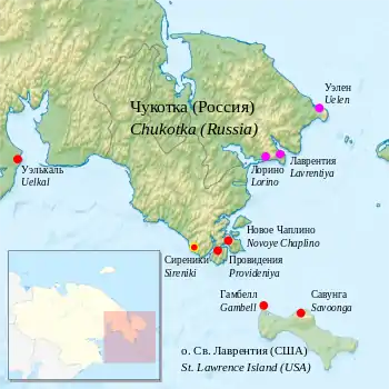 Além disso, a linguagem Eskimo Sireniki, chamada Uqeghllistun localmente, era uma língua falada na Sibéria que tinha muitas peculiaridades. Às vezes, é classificada como não pertencente ao ramo Yupik, formando assim (por si só) um terceiro ramo autônomo das línguas Eskimo (ao lado de Inuit e Yupik). [9][11] Its peculiarities may be the result of a supposed long isolation from other Eskimo groups in the past.[12]