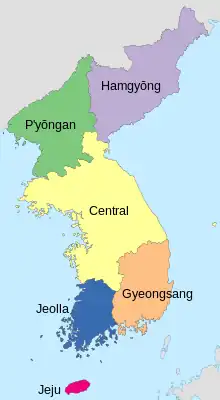 Todos dialetos do coreano são semelhantes entre si (com exceção de frases específicas do dialeto ou vocabulário não padrão exclusivo para dialetos), embora o dialeto da Ilha de Jeju seja divergente o suficiente para ser às vezes classificado como um idioma separado. A maioria dos dialetos tem o nome de uma das oito províncias tradicionais da Coreia.