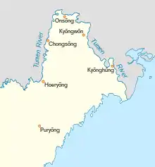 Quando o Rei Sejong expulsou os Jurchen do que agora é a parte mais ao norte da província de Hamgyong do Norte em 1434, ele estabeleceu seis guarnições (Yukchin) na curva do rio Tumen - Kyŏnghŭng, Kyŏngwŏn, Onsŏng, Chongsŏng, Hoeryŏng e Puryŏng - povoadas por imigrantes do sudeste da Coreia.