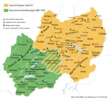 A fronteira linguística é conjunta e muda apenas ligeiramente. A inserção do reino de Borgonha no Sacro Império em 1032 e fundação da cidade de Freiburg por Zähringen em 1157 ampliou o uso do alemão. Existiram apenas algumas alterações locais envolvidas nos séculos seguintes e durante as guerras da Borgonha ou de reforma.
