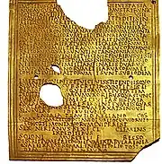 A leis romanas eram escritas em latim e a "letra da lei" estava estritamente ligada às palavras nas quais era expressa.[182] Contudo, qualquer língua podia ser usada em contratos verbais e procedimentos jurídicos mais genéricos baseados em jus gentium (direito romano aplicado a estrangeiros) ou leis internacionais.[183] O jus gentium não era um código legal escrito, mas pensa-se que existiu entre todos os povos como forma de direito natural. Os juristas romanos mostraram interesse pelas línguas locais como o púnico, gaulês e aramaico para se assegurarem do correto entendimento e aplicação de leis e contratos.[134]