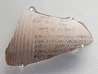 As inscrições em grego e latim de judeus atestam o bilinguismo ou multilinguismo dos judeus do Império Romano e a sua dispersão geográfica reflete a diáspora judaica.[141] Algumas inscrições podem ter a marca de Shalom no fim.[142] As evidências da presença de judeus no Egito é preservada por papiros até à revolta judaica de 116-117.[143] Na primeira metade do século V, o grego coexistiu com o latim e o judeu-aramaico nas comunidades judias da Palestina Prima e Secunda e encontra-se em inscrições de mosaicos inclusivamente em sinagogas.[58]