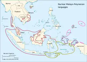 ![]() Mapa (em inglês) com os principais ramos das línguas malaio-polinésias nucleares: as ocidentais, em vermelho-escuro (não se está mostrando o chamorro), as centrais em verde, e as orientais em roxo e rosa. | |