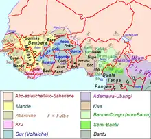 ![]() Mapa linguístico da África Ocidental. As línguas mandês estão em amarelo claro. | ||