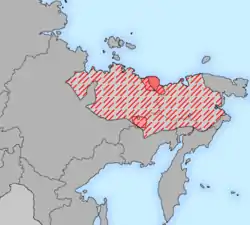 ![]() Distribuição das línguas yukaghir no século XVII (a tracejado) e no fim do século XX (sólido); os chuvans, que atualmente falam chukchi e russo estão assinalados a rosa | |