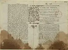 L'Ami du peuple (francês: [lami dy pœpl] , O Amigo do Povo) foi um jornal escrito por Jean-Paul Marat durante a Revolução Francesa. "O jornal radical mais célebre da Revolução", de acordo com o historiador Jeremy D. Popkin,[1] L'Ami du peuple era um defensor dos direitos das classes mais baixas contra aqueles que Marat acreditava serem inimigos do povo, o que ele não hesitou em mencionar em seus escritos. Esses documentos foram considerados perigosos porque muitas vezes provocavam comportamentos violentos e rebeldes.