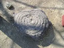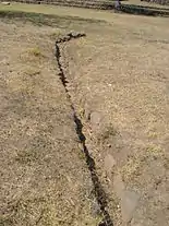 A um lado da Estrutura 2 do complexo arqueológico de La Campana encontram-se algumas pedras talhadas. Aqui também pode observar-se parte do sistema subterrâneo; realizado para coletar e evacuar a água das chuvas. Originalmente estava coberto com pedras. Seu traço segue o contorno dos edifícios.