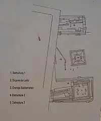 Encontra-se localizada a sul da praça e a sua base é de 52 por 36 m; é de grandes dimensões e a sua edificação é a base de plataformas superpostas e escalonadas. Remata num recinto sagrado retangular, em cujo interior existem vários círculos com funções provavelmente rituais. Seu acesso apresenta amplos degraus ornamentados por quatro cubos. Chama a atenção o que a altura dos degraus varia: Os primeiros são notavelmente mais altos que os seguintes. Depois do seu abandono continuou sendo objeto de culto, o que se infere pelos restos ósseos humanos encontrados a modo de oferendas. Na estrutura 1 encontra-se também o reboco de lodo, lugar onde ficaram evidências do reboco ou aplanado cozido que cobria os muros e pavimentos dos edifícios monumentais. É possível que sobre o reboco existissem motivos decorativos, realizados com pigmentos de minerais e terra de diferentes cores provenientes da região. Amostras de reboco podem-se ver também na parte inferior do acesso Leste da estrutura 3. À primeira vista observam-se pequenas partículas de forragem misturadas com o lodo, cuja função é nomeadamente desgraxante.