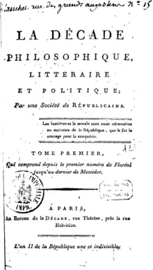 La Décade philosophique, politique et littéraire, ou simplesmente décade philosophique, foi um jornal filosófico e político fundado em 29 de abril de 1794, em meio à um dos momentos mais intensos do Terror, e publicado continuamente até 1807, suprimido então por ordem de Napoleão Bonaparte, em razão da qual será fundido com o jornal Mercure, de Chateaubriand.[1] Serviu de expressão do projeto intelectual e político dos Idéologues, a fim de continuar o esforço revolucionário iniciado nos comités de instrução pública, mobilizando especialmente os valores republicanos e o saber das humanidades, como também a economia política emergente.[2]