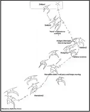 Ao final do jogo, questionado sobre se tinha feito o gol com a mão, Maradona assim respondeu: “Lo marqué un poco con la cabeza y un poco con la mano de Dios”.[1]