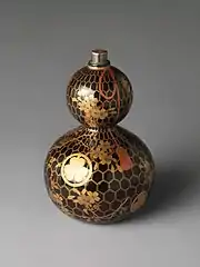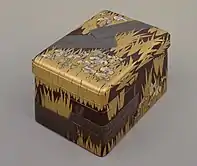Maki-e: Técnica comum na qual é borrifado pó de ouro ou de prata para criar desenhos e posteriormente a laca é polida.[52]