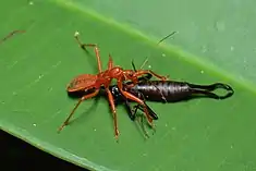 O primeiro caso é mais comum, onde o lado direito do macho fica atrás do lado esquerdo da fêmea e vice-versa. O macho então rotaciona a região posterior do abdômen em 180° e o posiciona abaixo do corpo da fêmea, fazendo com que os dois lados ventrais entrem em contato. A genitália do macho, achatada dorsoventralmente, é projetada e inserida na bolsa genital da fêmea. Os machos apresentam um espinho cuticular na genitália que é usado para se agarrar na bolsa genital, enquanto a virga se insere na vagina e no duto espermatecal. Contrações dos músculos associados ao duto ejaculatório conduzem o espermatóforo à espermateca da fêmea e, após a deposição, os indivíduos se separam e a cópula se encerra.[23]