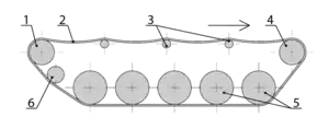 As lagartas são movidas por rodas motrizes dentadas, impulsionadas pelo motor e engatadas em aberturas ou cavilhas existentes nos elos da lagarta. Tipicamente, a roda motriz é montada bastante acima da área de contato com o solo, permitindo-lhe ocupar uma posição fixa. Colocar uma suspensão na roda motriz é possível, mas é mais complexo mecanicamente. Uma roda não motriz é colocada no extremo oposto da lagarta, primariamente para lhe dar uma inclinação que lhe permita superar obstáculos, mas também para lhe dar uma tensão adequada. Uma lagarta frouxa poderia desencaixar-se facilmente das rodas. Para evitar desencaixar-se, a superfície interior da lagarta tem normalmente espigões verticais de guia, que se engatam em sulcos ou ranhuras das rodas.