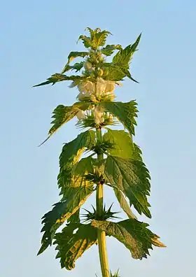 Tem longos rizomas, talo anguloso ascendente com folhas opostas cordiformes; cresce 5 a 10 dm de altura, com folhas, não-urticantes, de 3 a 8 cm × 2 a 5 cm, triangulares com base redonda, serradas superficialmente e parecidas com as de Urtica dioica. Flores brancas ou amareladas (a isto deve o nome e por ser parecida com a urtiga), dispostas em verticilos; medem 1,5 a 2,5 cm de comprimento.