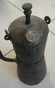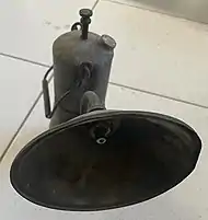 Em corpo metálico, lembrando um lampião, possui um cilindro (inferior) para armazenamento do carbureto, outro superior, com um tubo para saída do gás acetileno até o queimador na ponta, coberto por um defletor. No cilindro superior é colocada água que goteja até o cilindro inferior, misturando ao carbureto, causando a reação química e gerando o gás acetileno, que subirá pelo tubo até o queimador. Ainda no cilindro superior, há uma válvula que regula a pressão e volume de saída do gás até o terminal. [1][2]