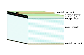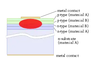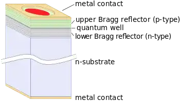 onde n é o índice de refracção da zona ativa, é o comprimento de onda pretendido para a monocromatização da onda no meio ativo e m refere-se à onda propriamente dita. É este tipo de cavidade que permite que a radiação fique confinada no meio ativo de tal modo que possa estimular decaimentos eletrónicos. Uma característica importante nestas heterojunções reside no modo em que a corrente elétrica passa por elas. Existem dois modos possíveis: a camada metálica dos extremos só existe por cima da zona ativa; deposição de uma camada isolante fora da zona ativa e posterior deposição da camada metálica; O material mais usado para as heterojunções do lado n e p no extremo são o AlxGa1-xAs e GaAs para o meio ativo p. É de referir que não é utilizado o silício como matéria prima dos lasers pelo facto da emissão espontânea e estimulada serem mais promovidas por processos de geração e recombinação diretos em vez de indiretos como acontece no silício. O funcionamento dos lasers com estrutura VCSEL é diferente deste último descrito por necessitar do tratamento quântico.