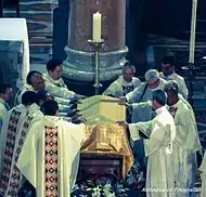 Padres venerando suas relíquias na Catedral Metropolitana de Medellín.