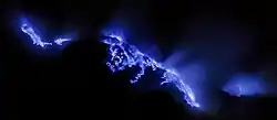O mais famoso destes incêndios ocorre regularmente no vulcão Kawah Ijen, na Indonésia, na ilha de Java , que tem alguns dos mais altos níveis de enxofre do mundo e é também um local de mineração de enxofre . Devido à ocorrência das chamas, Kawah Ijen também foi apelidado de “Vulcão Azul”. A cratera de Kawah Ijen é a maior área de chama azul do mundo. Kawah Ijen tem grandes quantidades de depósitos de enxofre e fumarolas , e as altas temperaturas do calor vulcânico subterrâneo frequentemente queimam o enxofre na superfície do vulcão, produzindo os fogos azuis. Quando o enxofre de dentro do vulcão rompe a superfície, ele pode atingir temperaturas de até 600 °C (1.112 °F), e o enxofre imediatamente encontra temperaturas e pressões mais baixas na superfície, o que faz com que o enxofre entre imediatamente em ignição e entre em erupção. chamas azuis até 5 metros (16 pés) no ar. Em temperaturas tão altas, o enxofre derrete, que às vezes flui pela face do vulcão enquanto carrega consigo as chamas, fazendo parecer que a lava azul está fluindo pelo vulcão. Devido à cor azul das chamas, os incêndios são essencialmente visíveis apenas à noite, pois são indistinguíveis durante o dia. [3]